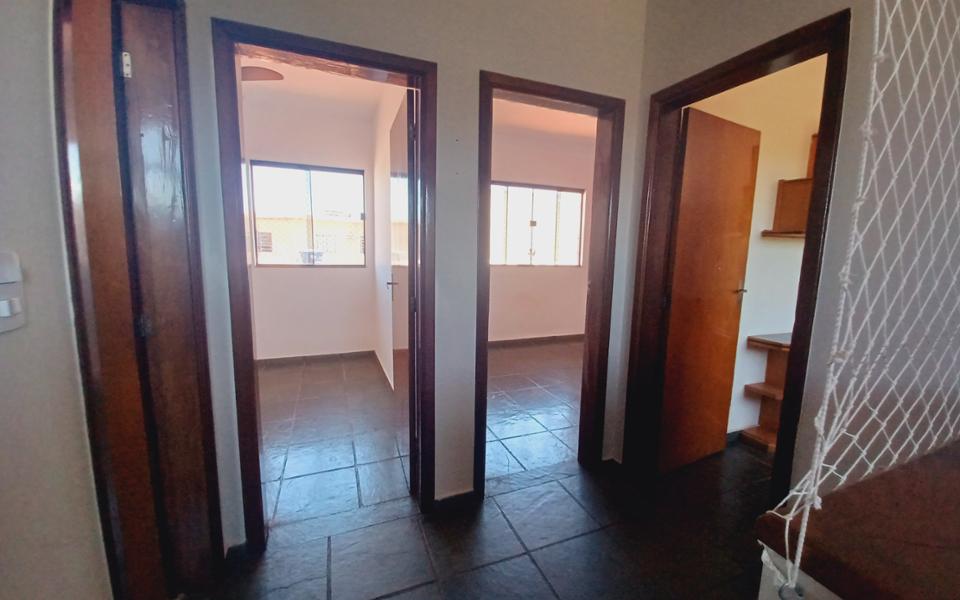 São 3 quartos na parte superior. Será entregue como está nas fotos. Documentos exigidos: fiador com imóvel em Campo Grande ou seguro fiança locatício, seguradora ou banco ou caução de 2 aluguéis em dinheiro. Seguro contra incêndio obrigatório. IPTU incluso. Não trabalhamos com reservas.